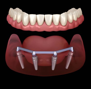 The Smart Upgrade This is the perfect bridge between traditional dentures and fixed teeth. We place 2 to 4 implants in the jaw, and your denture is fitted with special "snap" attachments.